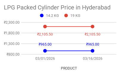 LPG 14.2kg cylinder price remained unchanged in Hyderabad, Telangana for the second half of March 2026. LPG 19kg cylinder price kept flat for the second half of March 2026 in Hyderabad, Telangana.